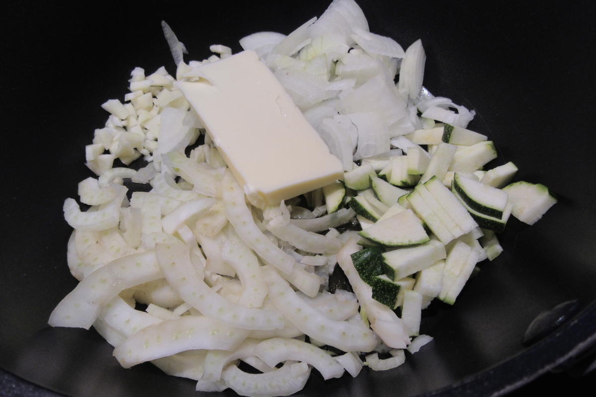 2. Zwiebel und Knoblauch schälen, Zwiebel in halbe Ringe, Knoblauch in kleine Würfel schneiden. Fenchel hobeln und das Stück Zucchino in kleine Stücke schneiden.