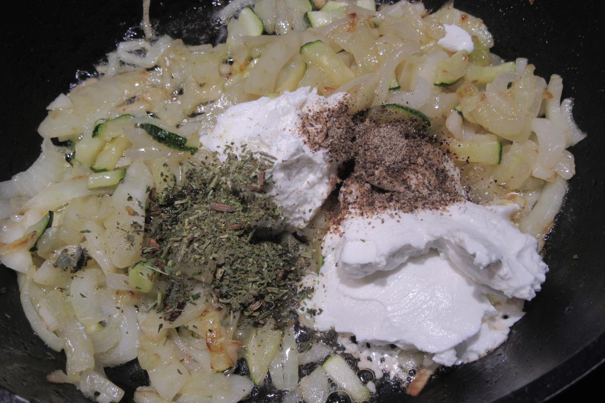 3. Butter und Öl in einer Pfanne erhitzen und das Gemüse darin anbraten, bis es gar ist. Ziegenkäse unterrühren und dann die gegarten Rosenkohlviertel dazu geben. Mit der italienischen Kräutermischung, Salz und Pfeffer abschmecken. Die Béchamelsoße einrühren und eventuell mit etwas Milch verdünnen. Zum Schluss den geriebenen Parmesankäse unter das Gemüse mischen.