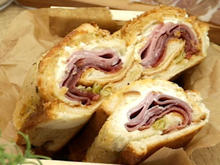 Spargelsuppe mit Rucola-Basilikum-Pesto, dazu Dinkelbaguette mit Roastbeef