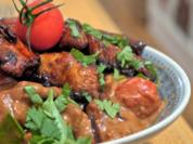 Knusperhuhn mit Tomaten-Erdnusssauce an Vollkorn-Jasmin-Reis